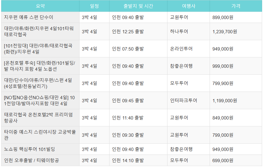 대만 여행 3박 4일 패키지 비교
